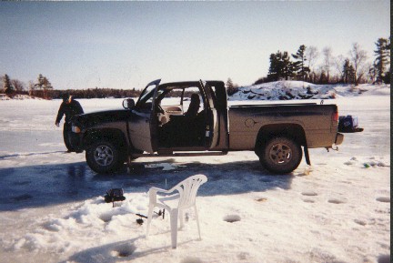 My Dad and myself just arrived and are just setting up, roads out here can get pretty mucky, so dont mind my dirty truck, you can see the fish finder and two rods set up, and lots of round holes in the ice, and lawn chairs are handy for ice fishing.